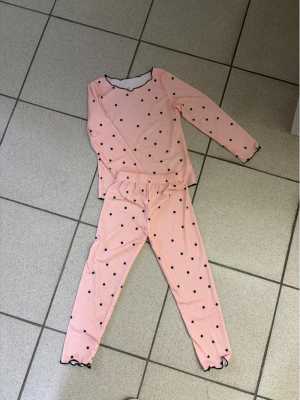 Детская пижама розового цвета с черными точками. Комплект состоит из верха и низа, подходит для роста 50-60 см.