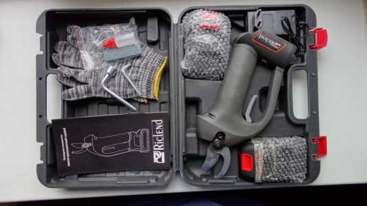Мощный секатор! Мощность - 1000 Вт. Бесщёточный двигатель! Максимальный диаметр реза - 30 - 35 мм. Упакован в удобный кейс.